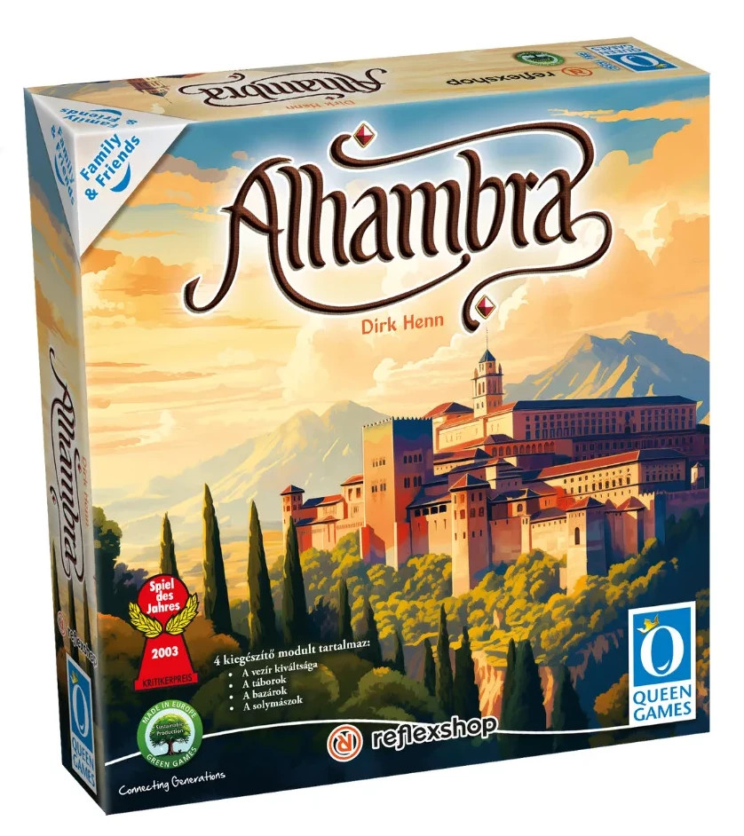 Granada, a csodálatos Alhambra hazája. Ennek a fantasztikus épületkomplexumnak a részeit kell felépítenetek, hogy bebizonyítsátok, ti vagytok a környék legjobb építészei és kereskedői. A játékban különböző formában kell finanszírozni a saját építkezéseteket, a megszerzett pénzzel pedig csinosítani, bővíteni kell a saját épületeiteket. Egy igazi klasszikus, mely most 4 kiegészítő modullal érkezik egy dobozban!