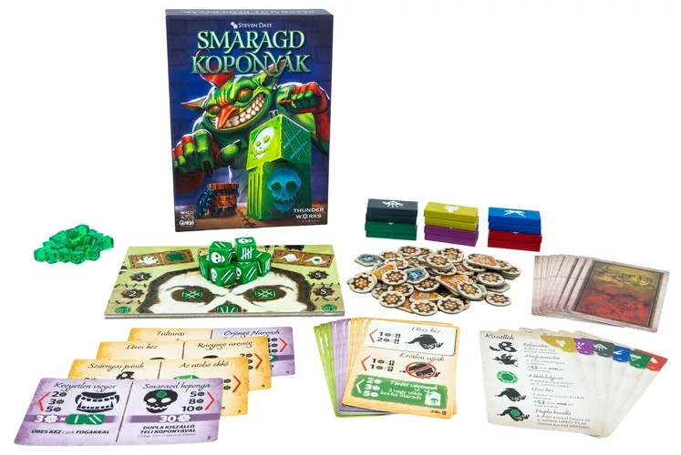 A Smaragd koponyák izgalmas szerencsejáték, amelyben a játékosok felváltva töltik be a „kockáztató” szerepét, aki igyekszik minél több kockát lehelyezni az öt szintből álló koponyatáblára. A szabály egyszerű, de kegyetlen: csak a kockáknak megfelelő értékű szinten töltheted fel a táblát, és csak a már korábban lerakott kockák szintjére, vagy azok fölé. Eközben a többi játékos gyors fogadásokat köt a „kockáztató” játékos dobásainak eredményére – minél hamarabb teszik meg a tétet, annál nagyobb a nyereményük. A játék addig tart, amíg a fogaskerekek készlete el nem fogy. A győztes pedig az lesz, aki a legtöbbet gyűjti össze belőlük!